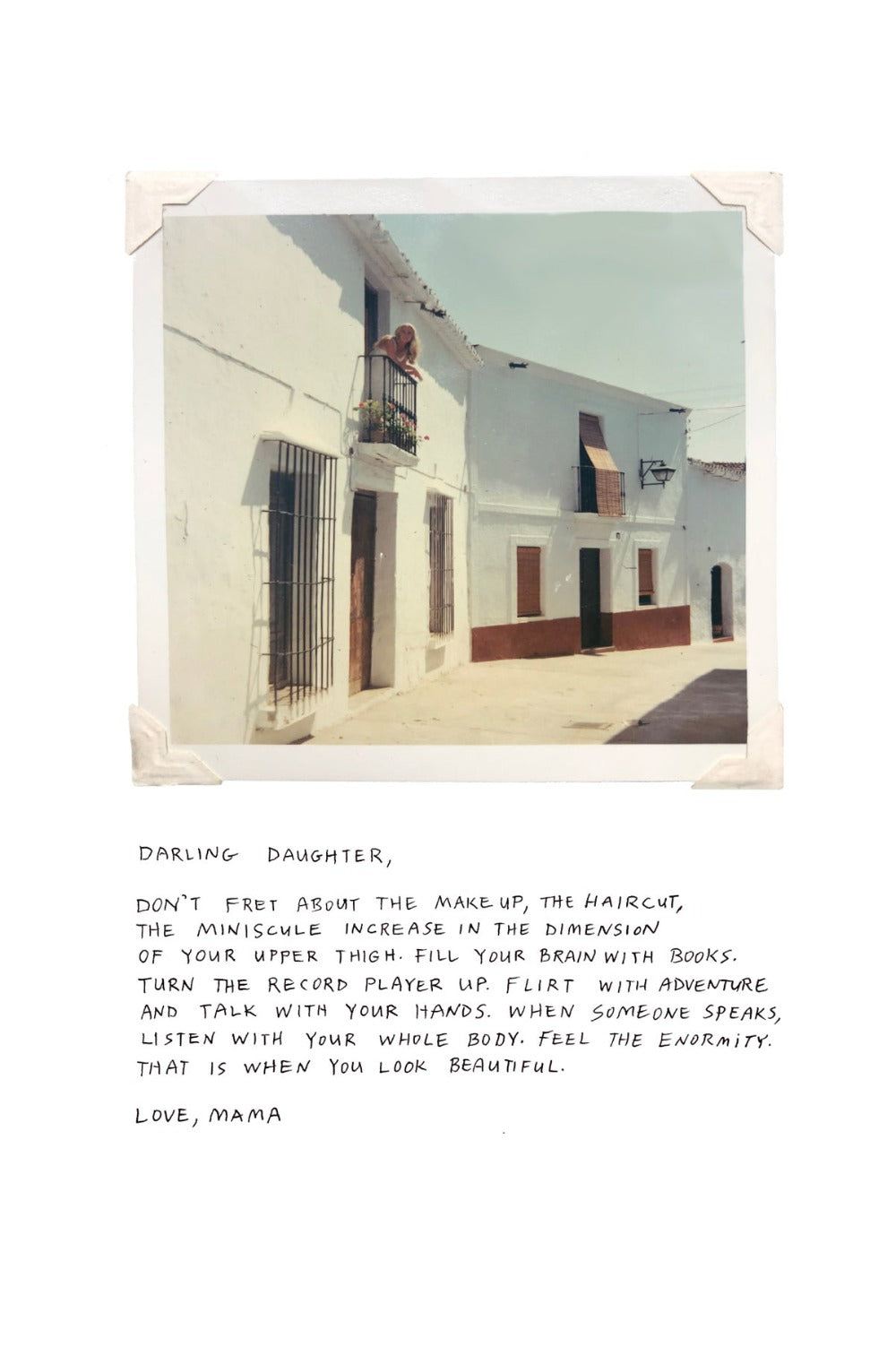 Limited edition print. Collage of vintage photograph of the artists' mother in Nerja, Spain c. 1967 accompanied by an imagined hand-lettered note from mother to daughter. Size is 12 x 18" . Small batch printing on fine heavyweight matte paper in Santa Barbara, CA.