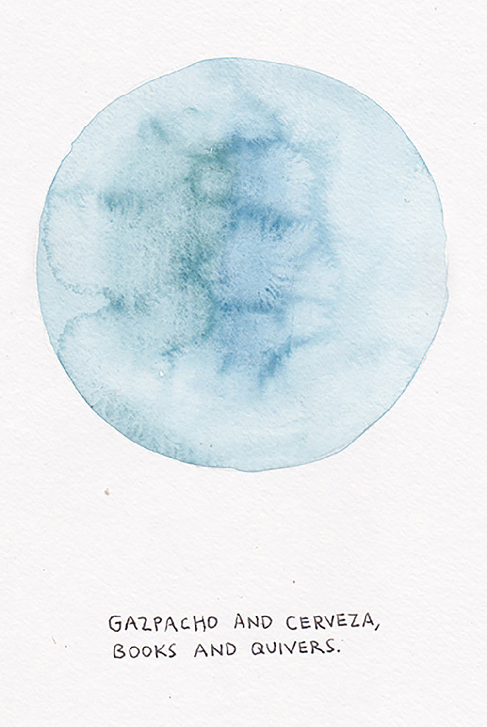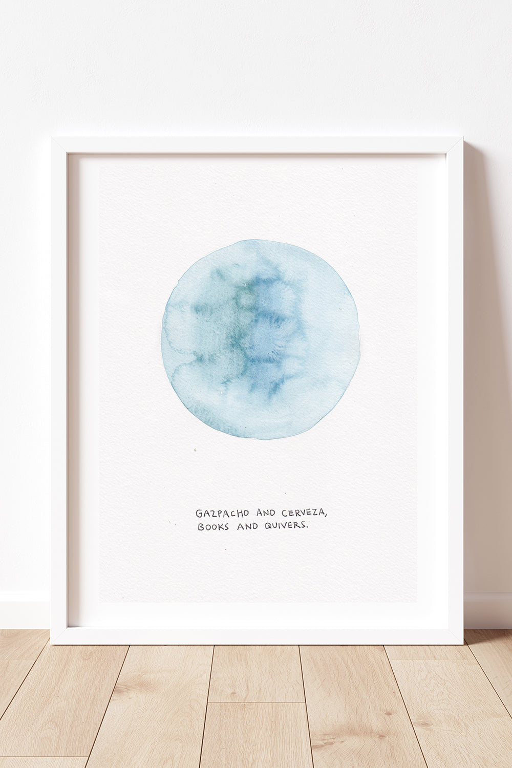 Blue orb. "Gazpacho and cerveza. Books and quivers." Original watercolor and ink on paper by Olivia Joffrey. Signed on reverse.