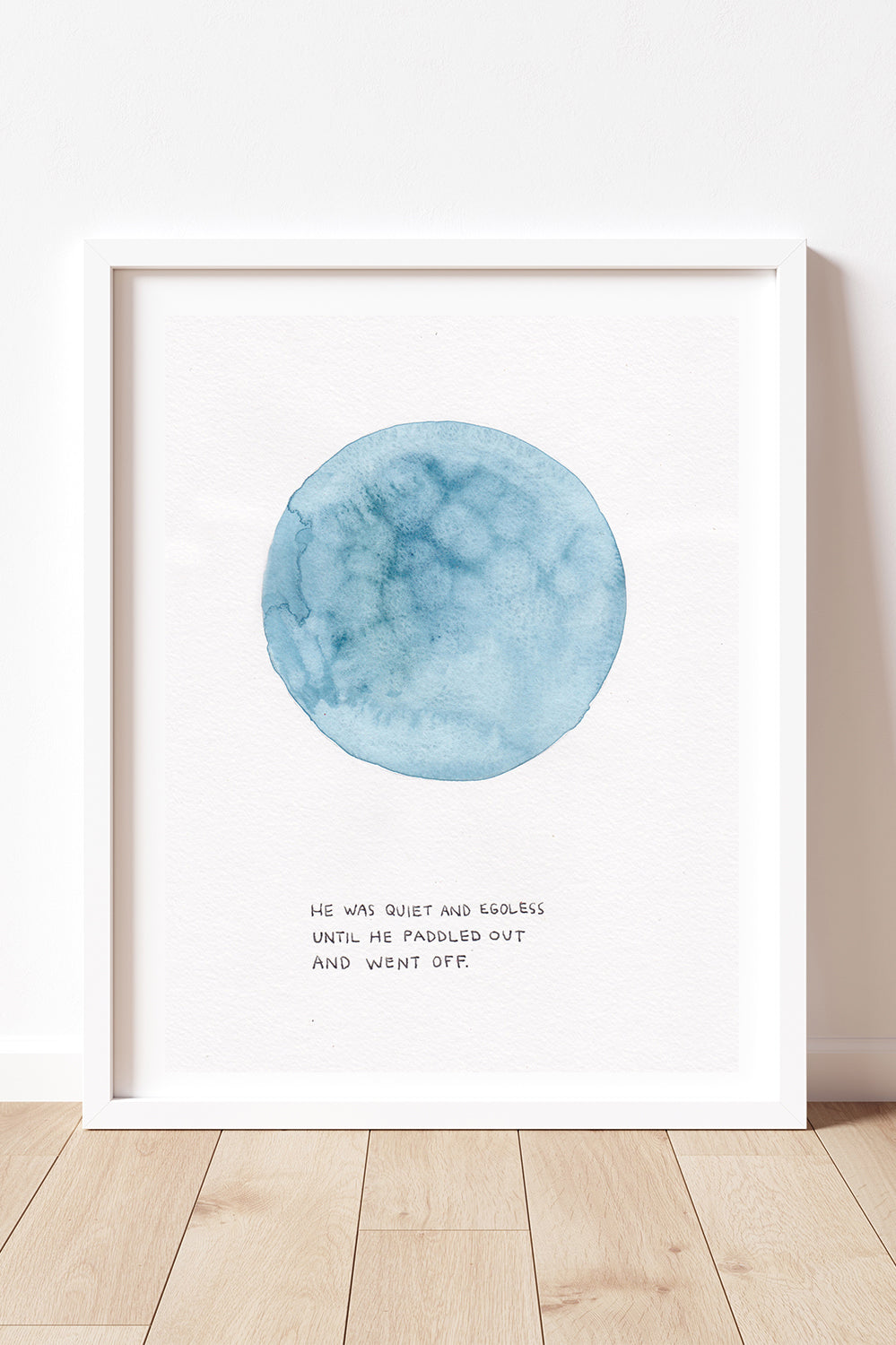 Blue orb. "He was quiet and egoless until he paddled out and went off." Original watercolor and ink on paper by Olivia Joffrey. Signed on reverse.