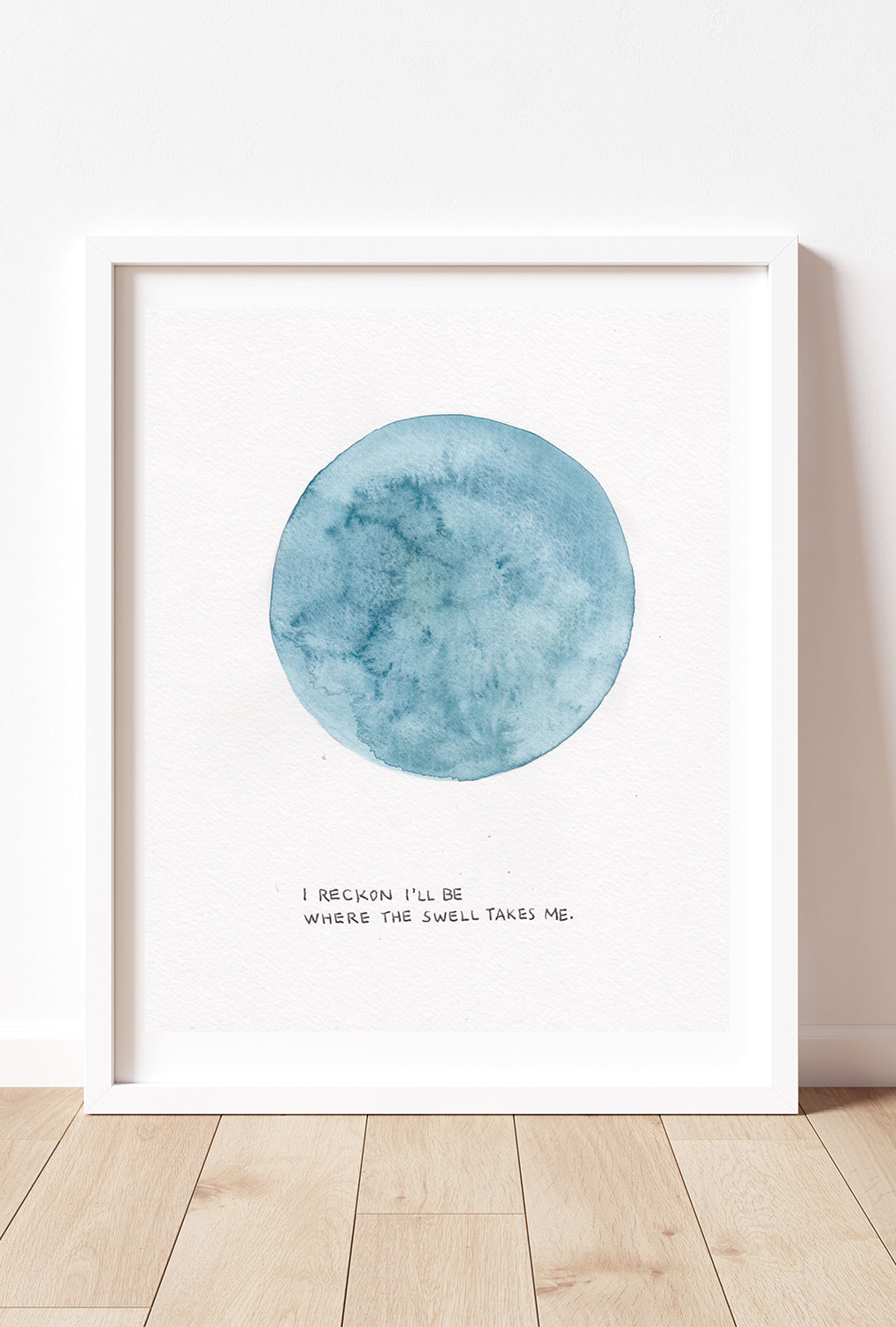 Blue orb. "I reckon I'll be where the swell takes me." Original watercolor and ink on paper by Olivia Joffrey. Signed on reverse.